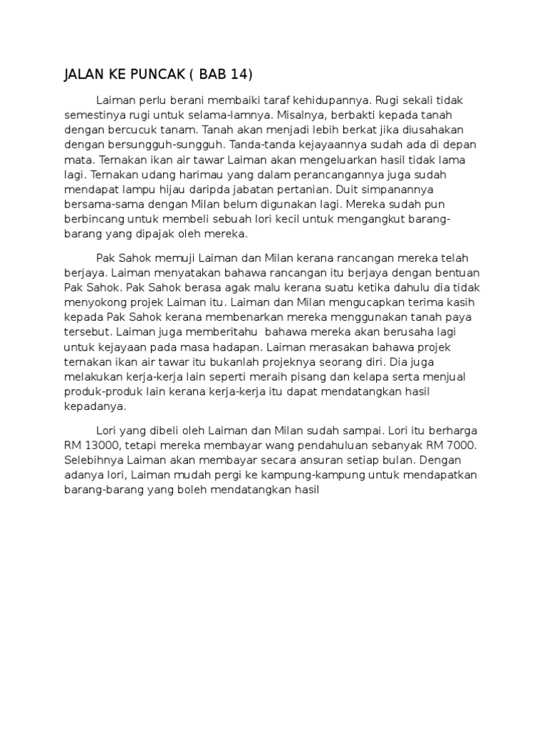 Contoh Jawapan Novel Jalan Ke Puncak. Perbualan antara alias dengan ibunya yang mengadu chot, iaitu beruk peliharaannya hilang ketika alias ingin ke sekolah. Ibu alias menasihatinya agar dia tidak risau akan beruknya itu dan segera pergi ke sekolah sebelum terlewat.